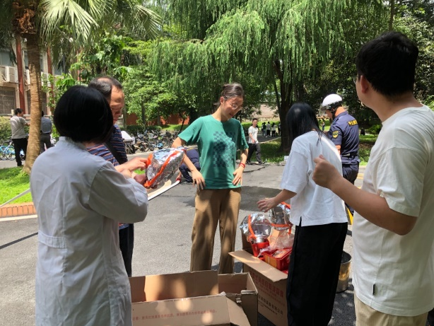 随后,在生命科学楼2号楼301室模拟了一场电器短路火灾。随着警报声响起,物业人员迅速切断电源,电梯停运。师生们迅速反应,报警并尝试扑灭初起火源。救援人员迅速赶到现场,评估火势后启动紧急疏散预案。各楼层人员有序撤离至一楼集合点,完成人数清点。同时,保卫处志愿消防队员对楼层进行搜救和灭火作业,利用消防云梯成功救援被困学生。整个演练过程高效有序,有效检验了师生的应急处理能力。