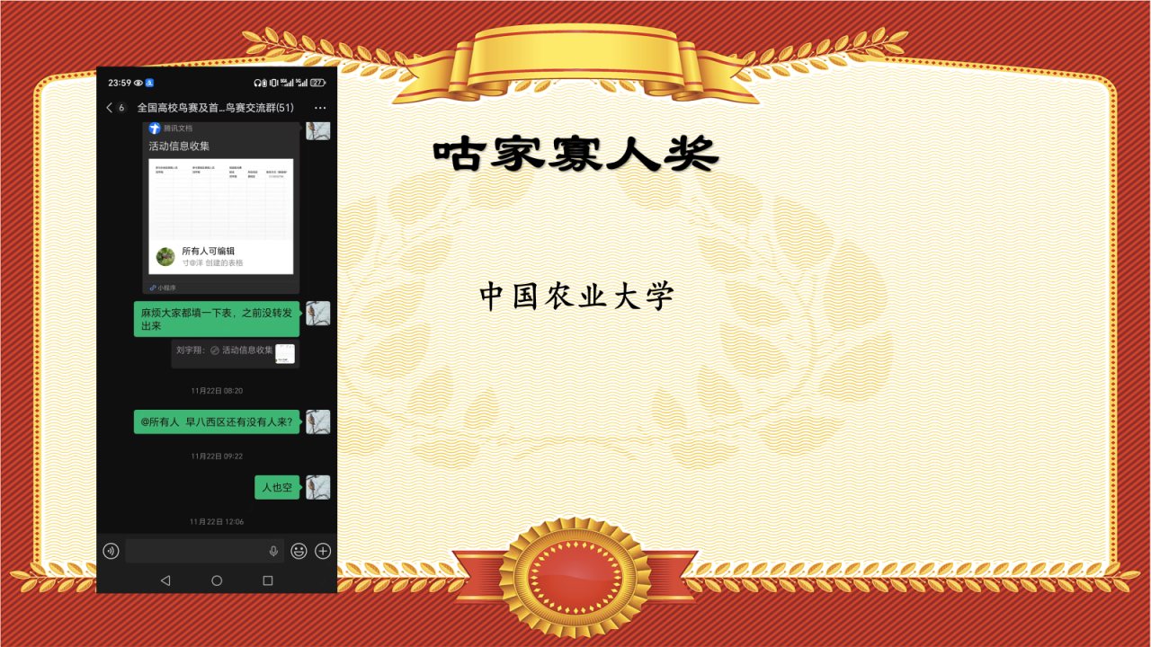 中国农业大学在比赛当日,只有队长一人到场,惨遭其他队友咕咕,最终以一己之力完成了比赛,特颁发“咕家寡人奖”以示鼓励!