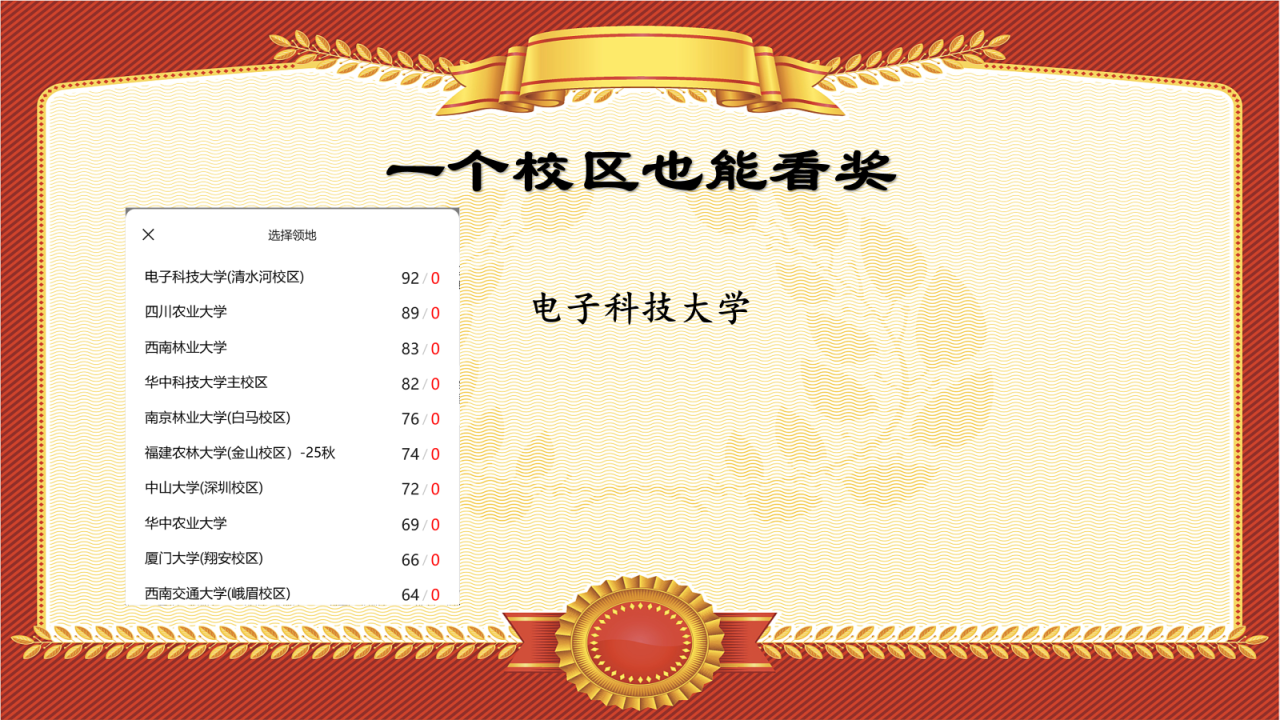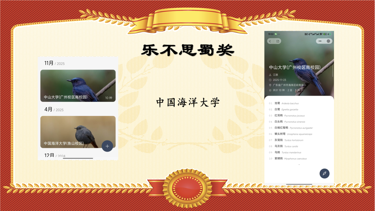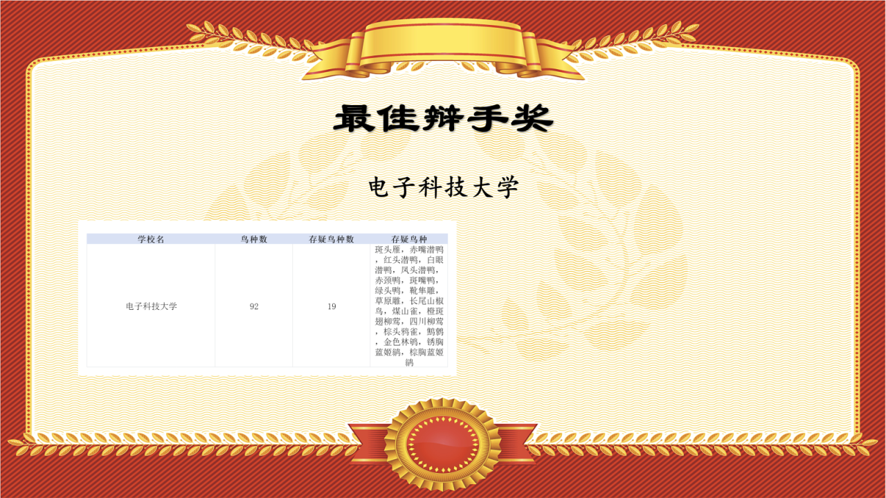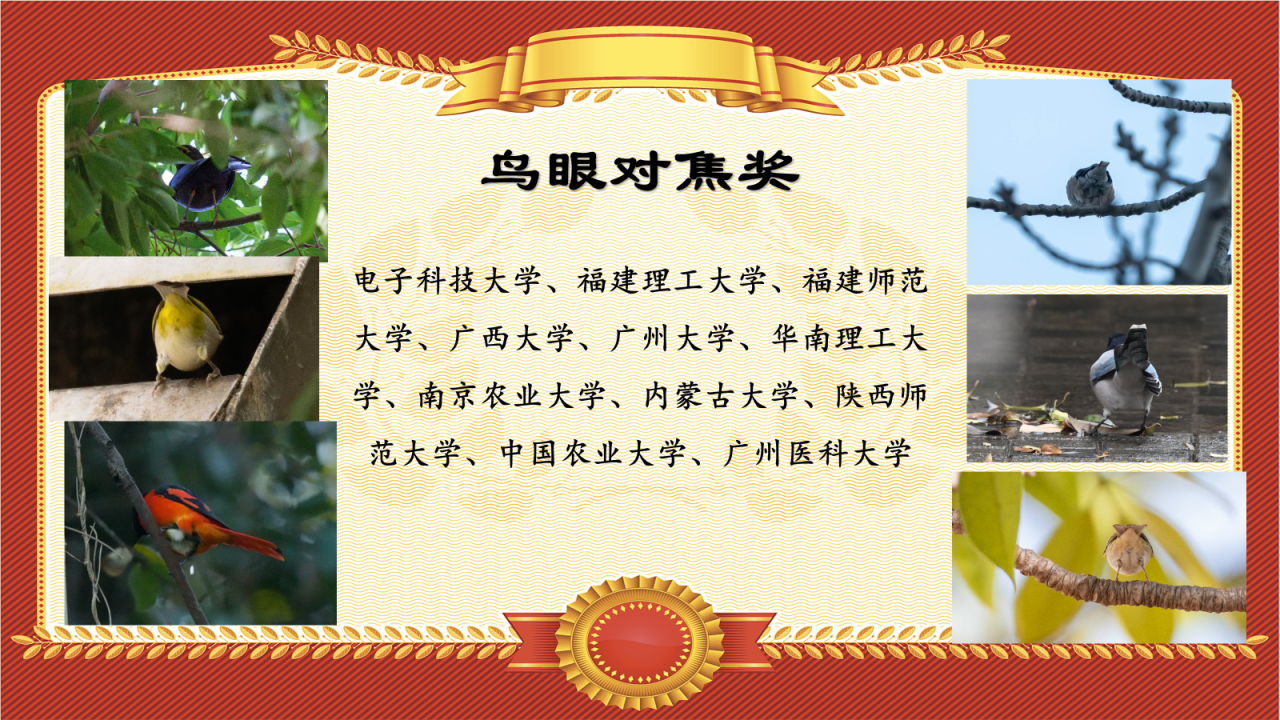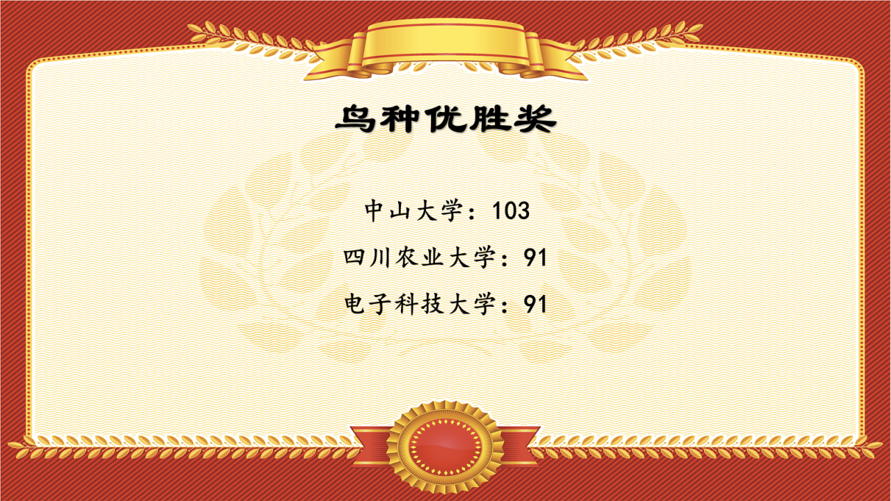 在参赛的所有高校中,电子科技大学以一个校区92种(审核后91种)的记录,夺得所有队伍中单校区最高鸟种纪录,故授予“一个校区也能看奖”!