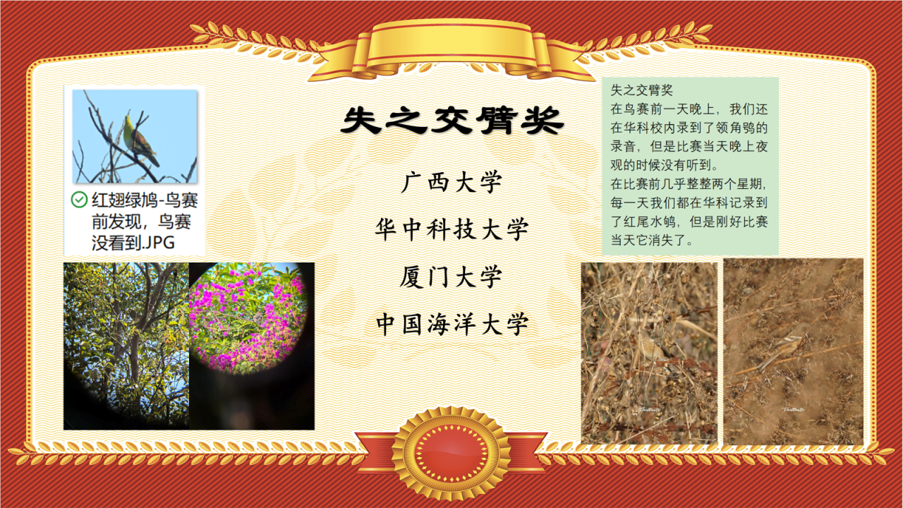俗话说“鸟不等人”,有些队伍在鸟赛当天没有记录到的高光鸟种,偏偏在鸟赛前/后现身,令人惋惜。广西大学、华中科技大学、厦门大学、中国海洋大学因之在本次鸟赛中痛失高光鸟种,包括红翅绿鸠、牛头伯劳、红尾斑鸫、长尾雀等等,颁发“失之交臂奖”以纪念。