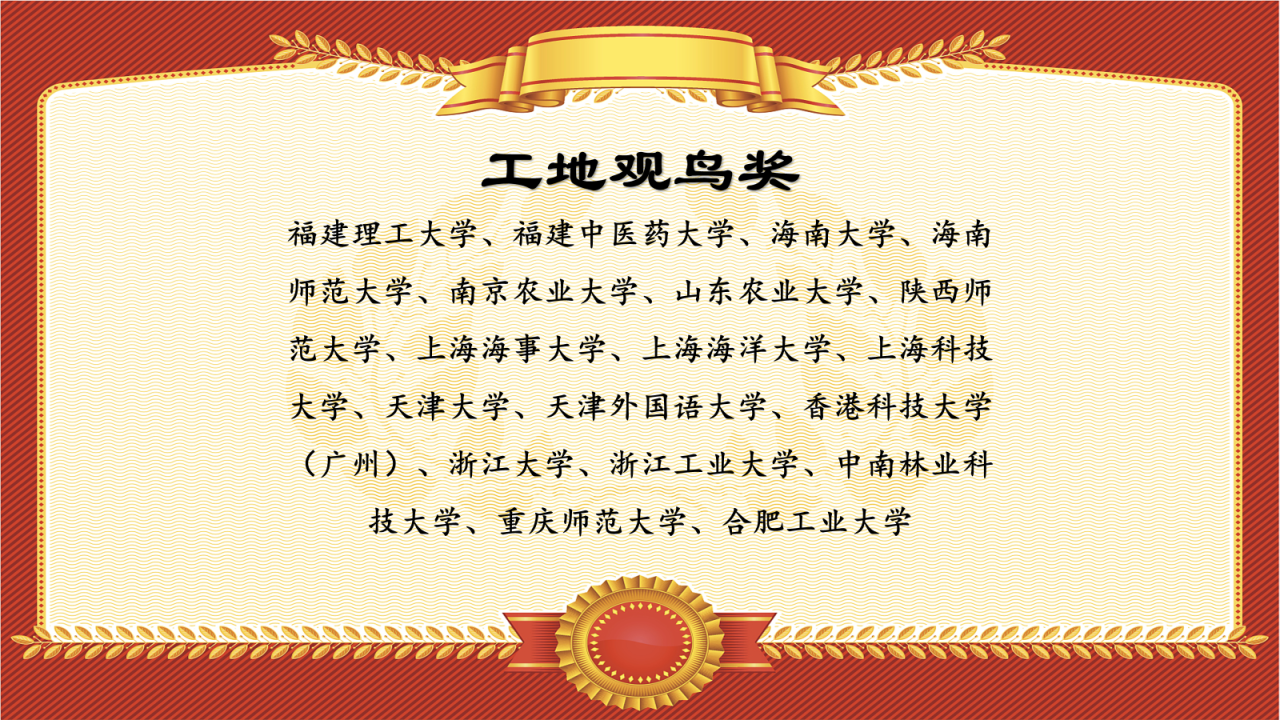 每届鸟赛,总有一些校园处于施工当中,于是只能“工地观鸟”,本次不幸获得本奖项的学校是——福建理工大学、福建中医药大学、海南大学、海南师范大学、南京农业大学、山东农业大学、陕西师范大学、上海海事大学、上海海洋大学、上海科技大学、天津大学、天津外国语大学、香港科技大学(广州)、浙江大学、浙江工业大学、中南林业科技大学、重庆师范大学、合肥工业大学共18所高校,希望以上学校的生境早日恢复,让鸟儿们重返校园~