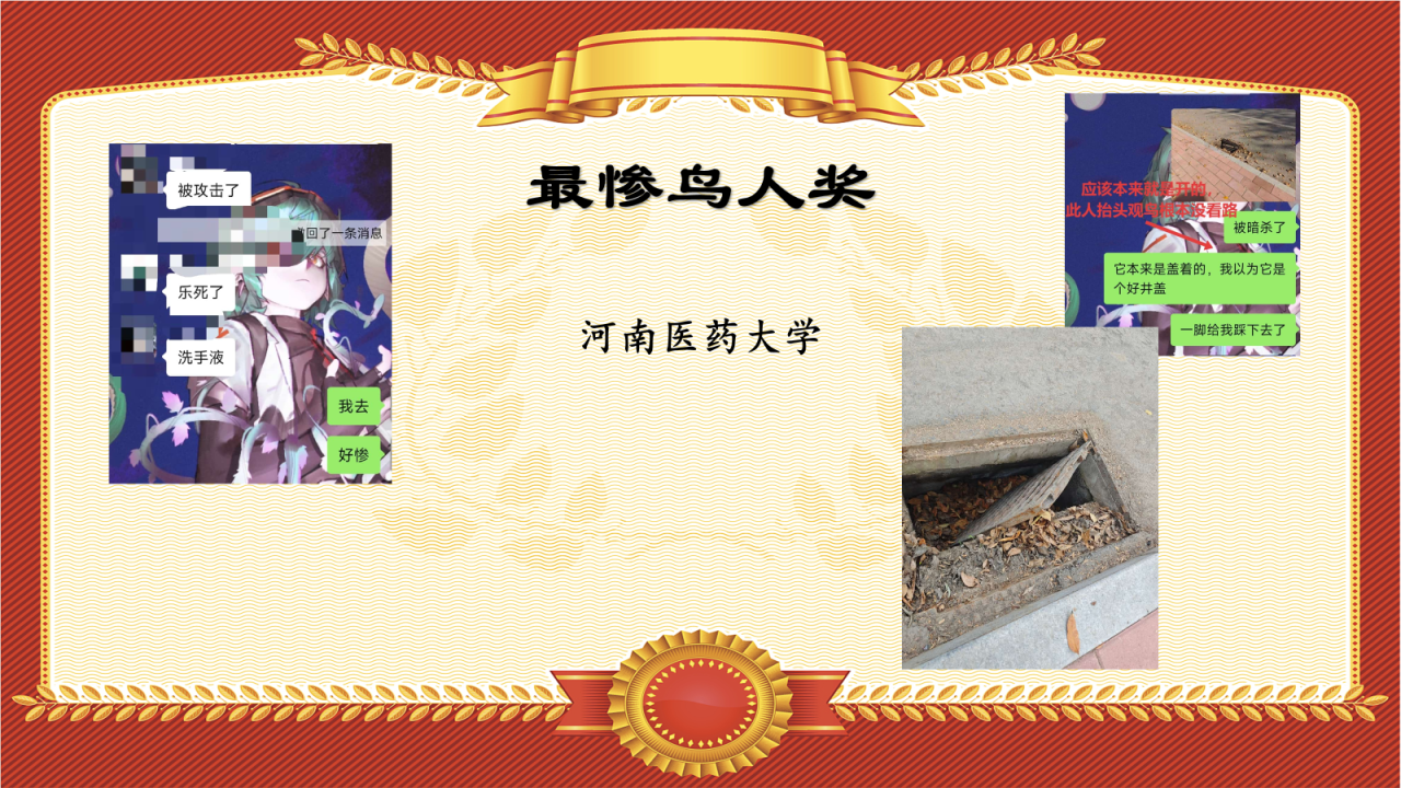 安徽农业大学的同学在观鸟时不慎进入一处企业园区,而后被工作人员发现并差点报警,颁发“我是良民奖”以纪念。