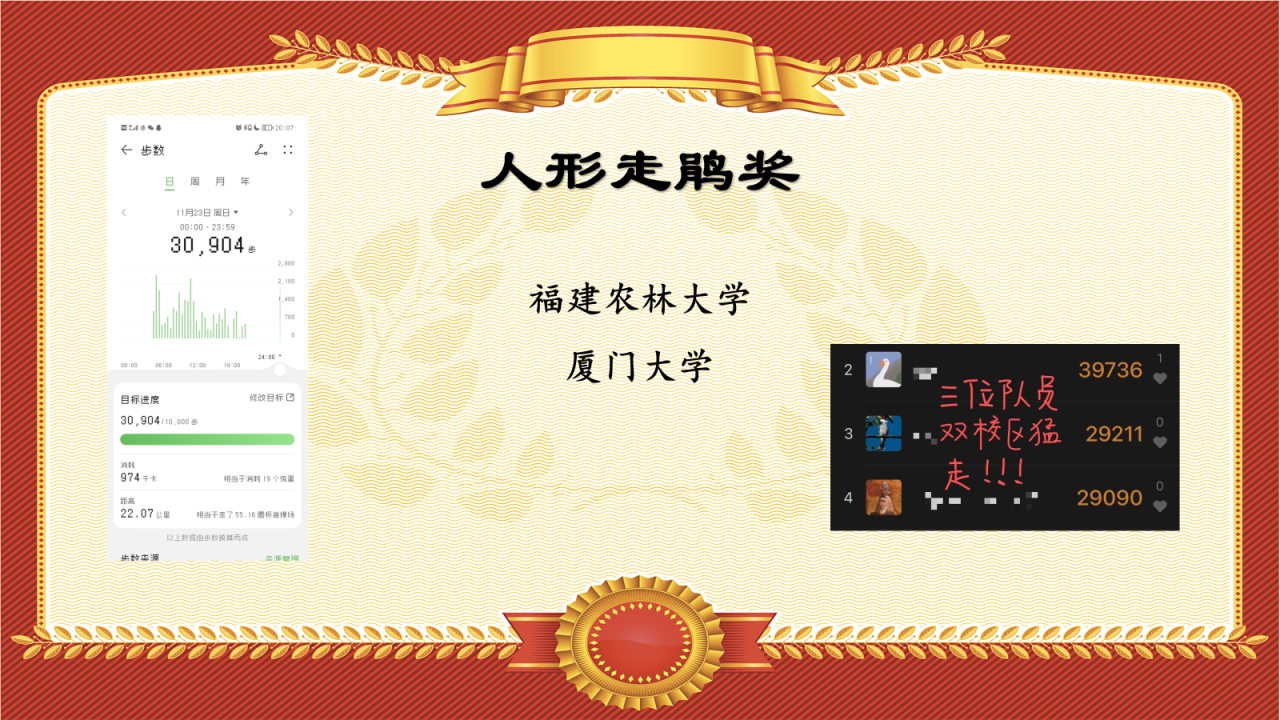论参加鸟赛的人有多能走——在本次鸟赛中,福建农林大学和厦门大学的同学们,以30000步~40000步的步数记录,获得当之无愧的“人形走鹃”称号。