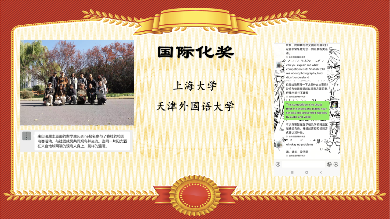 在本次鸟赛中,上海大学和天津外国语大学两支队伍都邀请到了国际友人共同参赛,来自世界各地的文化在观鸟过程中碰撞交融,绽放出独特的活力。也期待在未来能有更多国际友人、甚至国际队伍能加入到高校鸟赛大家庭中~