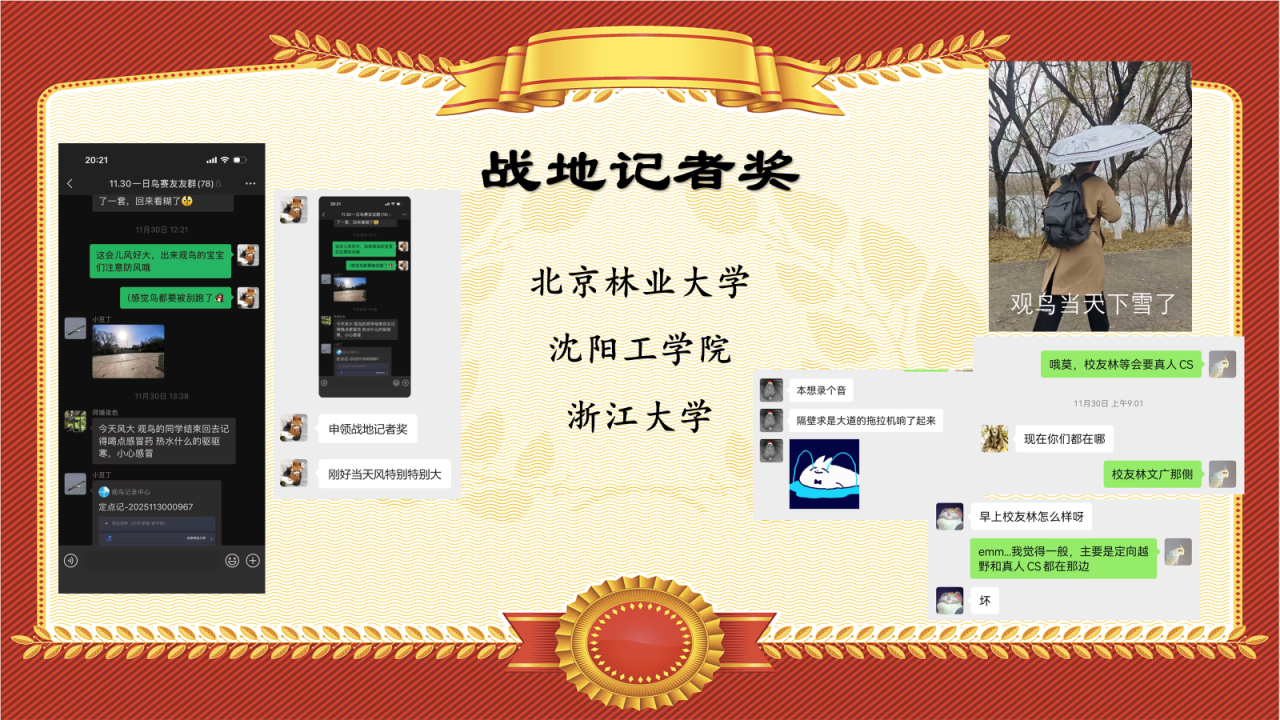无论天气、环境多恶劣,都挡不住观鸟人的热情!在比赛当日,北京林业大学、沈阳工学院的同学顶着大风降雪仍然奋斗在观鸟一线,而浙大的同学更是冒着校内真人CS的“枪林弹雨”,真正实现了“战地观鸟”,因此颁发“战地记者奖”以示表彰。