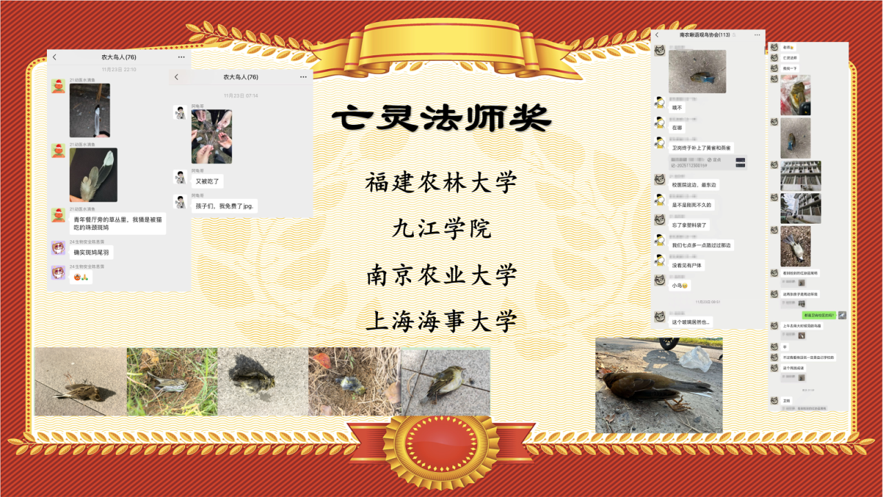 植被茂密的高校校园,固然可以成为众多候鸟的停留场所,但校内的建筑玻璃、流浪动物、往来车辆等威胁,往往也会构成候鸟的“生态陷阱”。在此次比赛中,福建农林大学、九江学院、南京农业大学、上海海事大学都发现了鸟类的尸体,它们或因鸟撞,或因猫抓等等因素,成为了迁徙路上的亡魂。让我们以“亡灵法师奖”,祭奠这些不幸的小生命。