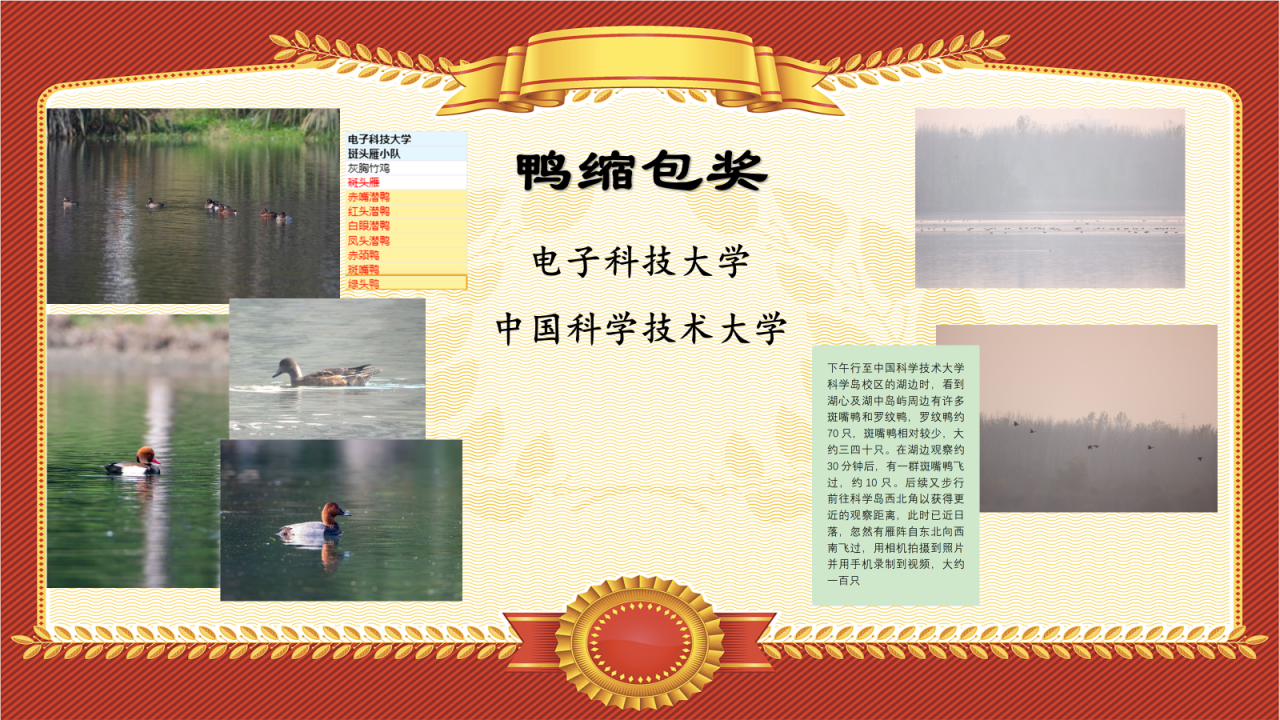 在本次比赛中,电子科技大学凭借清水河校区的一个湖,收获了赤嘴潜鸭、红头潜鸭、白眼潜鸭、凤头潜鸭、赤颈鸭、斑嘴鸭、绿头鸭共7种雁形目,从鸟种数上遥遥领先;而中国科学技术大学则从个体数量上取得优势,记录了七十余只罗纹鸭和三四十只斑嘴鸭,场面堪称壮观。让我们把“鸭缩包奖”颁给以上队伍!