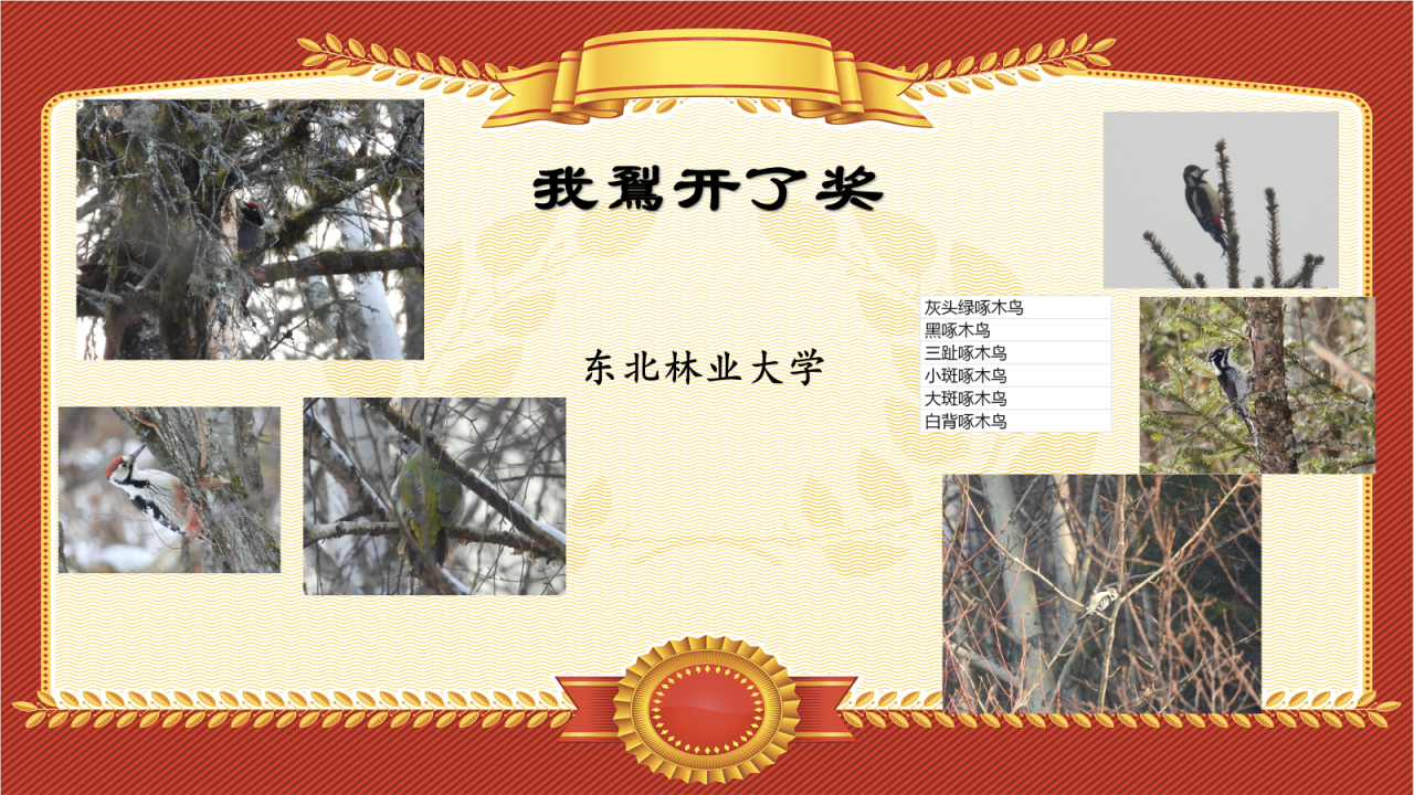 东北林业大学在鸟赛中共记录到灰头绿啄木鸟、黑啄木鸟、三趾啄木鸟、小斑啄木鸟、大斑啄木鸟、白背啄木鸟共6种鴷形目,让南方孩子们直呼羡慕。故颁发“我鴷开了奖”以纪念!