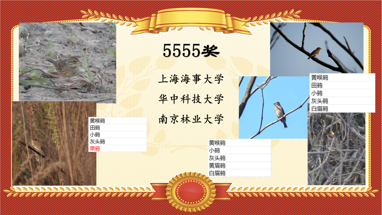 上海海事大学、华中科技大学、南京林业大学在鸟赛中分别记录到了5种鹀类,在所有队伍中并列第一,故颁发“5555奖”。(可惜的是,原定与之配套的“6666奖”因并列第一太多,未能颁发,希望下届鸟赛能有队伍斩获此奖~)