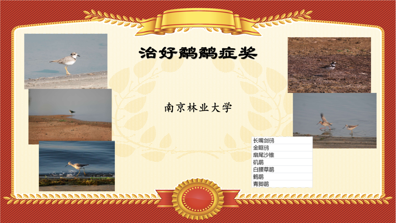 当校园里有一方生境良好的湿地,众多鸻鹬总能治好鸟人们的“鹬鹬症”。南京林业大学在本次鸟赛中记录到了长嘴剑鸻、金眶鸻、矶鹬、白腰草鹬、鹤鹬、青脚鹬共6种鸻鹬,故颁发“治好鹬鹬症奖”以纪念!