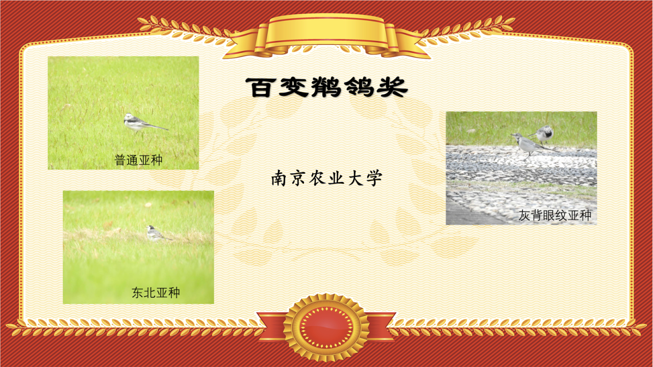 在鸟赛中,南京农业大学的同学们记录到了白鹡鸰的三个亚种——普通亚种、东北亚种和灰背眼纹亚种,而更神奇的是,这三个亚种竟巧合地出现在同一片草坪上!让我们把“百变鹡鸰奖”颁给南京农业大学~