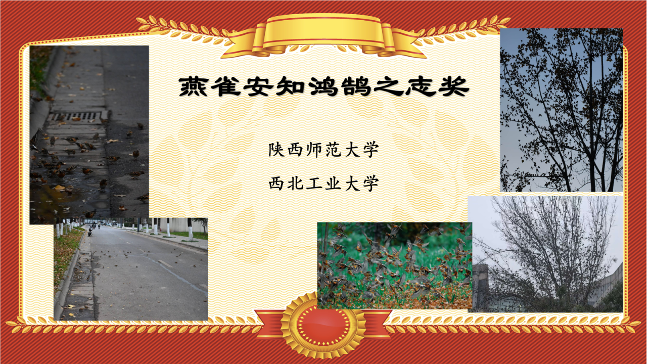 天气渐冷,燕雀科的小鸟纷纷集成大群,在地上、树上觅食。在本次鸟赛中,陕西师范大学、西北工业大学记录到了大群的燕雀,令人不禁直呼“密恐犯了”!让我们把“燕雀安知鸿鹄之志奖”颁给以上两个队伍~