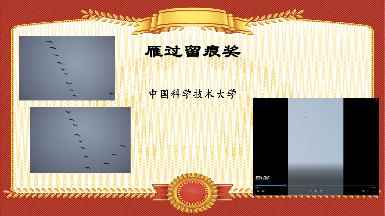 在鸟赛当日,中国科学技术大学的同学们拍摄到了震撼的雁阵,如右下图所示,在空中排成长长的“人”字形,缓缓南飞;让我们把“雁过留痕奖”颁给中科大的同学们!