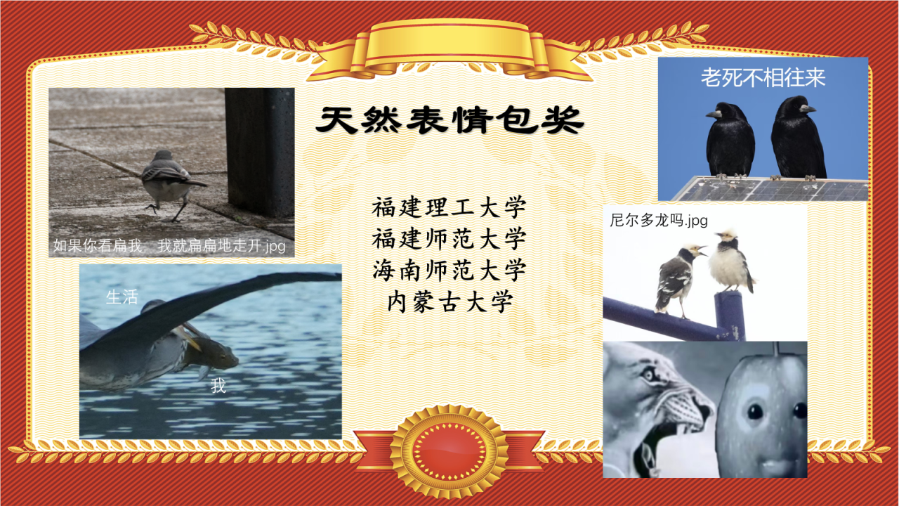 本次鸟赛中,福建理工大学、福建师范大学、海南师范大学、内蒙古大学的同学们拍到了天然的小鸟表情包,故授予其“天然表情包奖”。话不多说,直接上图!(自行取用~)