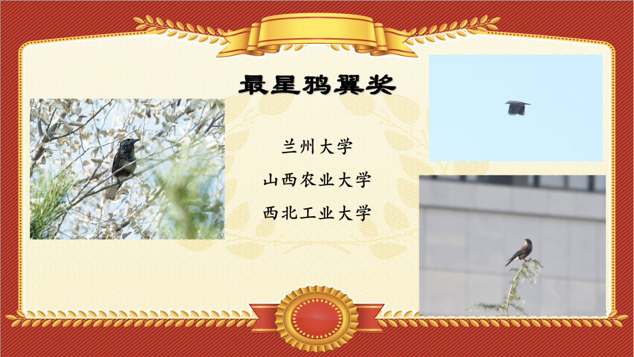 这个奖项致敬各位鸟赛卷王,他们有的从0点一过便开始夜观,有的凌晨五六点便起床观鸟,有的临近半夜还奋斗在夜观一线,令人钦佩。让我们祝贺安徽大学、华中科技大学、西北工业大学的朋友们获得“起早贪黑奖”!