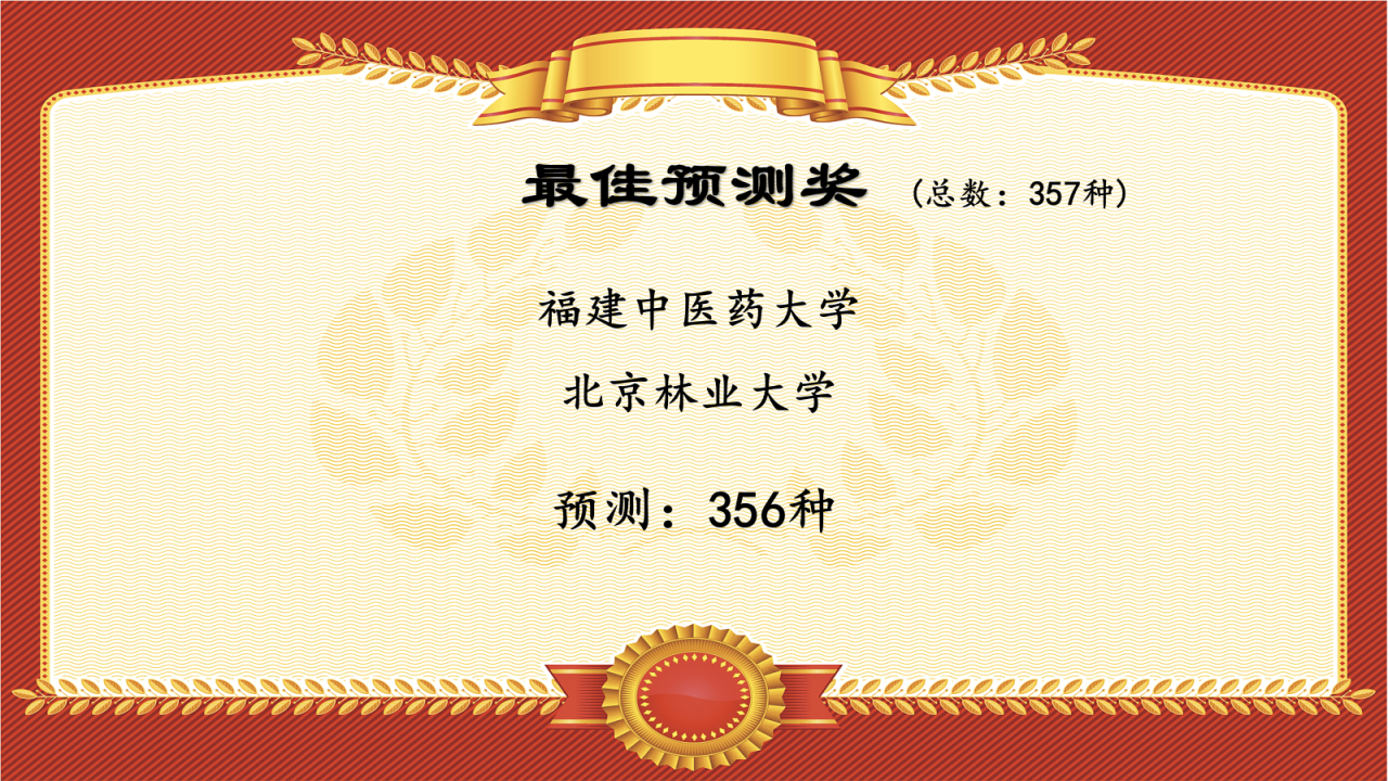 最后,让我们公布最佳预测奖——福建中医药大学和北京林业大学,以1种的偏差,近乎完美地预测了本次鸟赛的最终总鸟种数(357种),让我们掌声恭喜以上两支队伍!