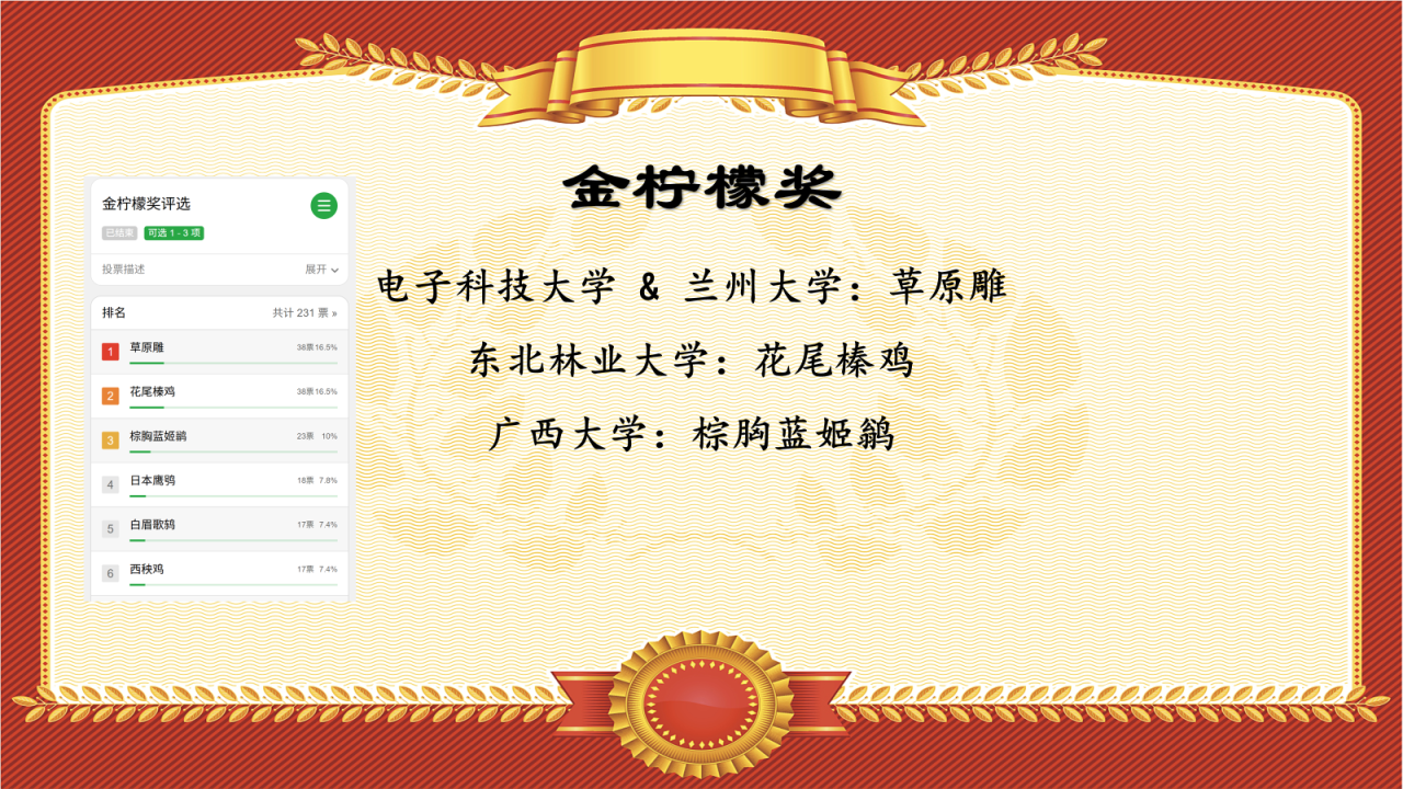 根据参赛群成员们的投票,选出了草原雕、花尾榛鸡和棕胸蓝姬鹟为本次鸟赛最令人羡慕的鸟种,而这些鸟种分别来自——电子科技大学、兰州大学、东北林业大学和广西大学!