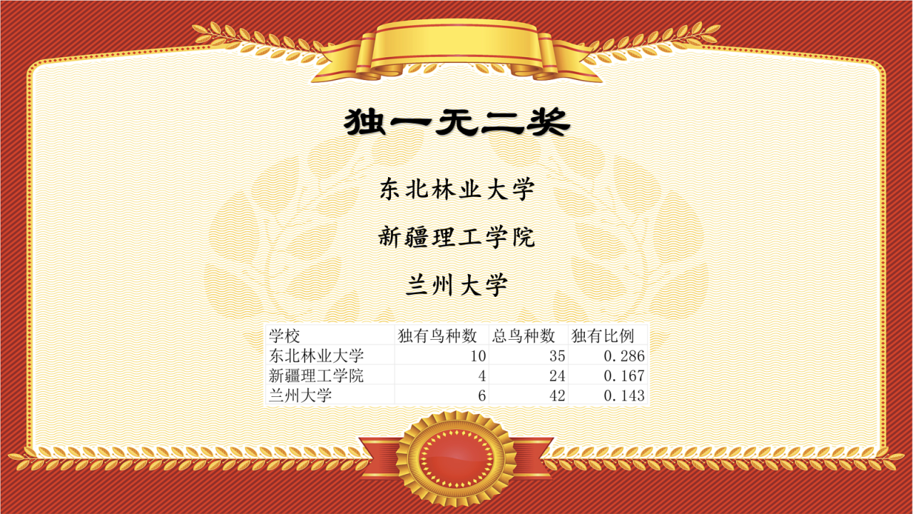 东北林业大学、新疆理工学院和兰州大学,凭借其独特的地理位置优势,以及参赛成员的努力,获得独有鸟种比例最高的前三名!