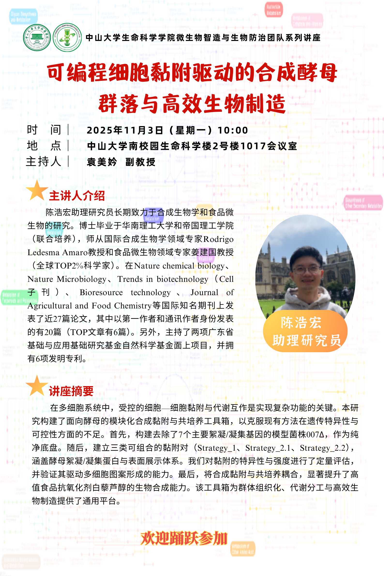 2025年11月3日生命科学学微生物智造与生物防治团队系列讲座:可编程细胞黏附驱动的合成酵母群落与高效生物制造