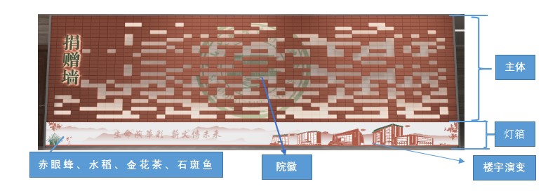 捐赠墙采用不锈钢金属框边结构,分上下两个部分。上部墙面以代表中大建筑风格的红砖块辅以磨砂玻璃砖块堆砌成捐赠墙主体,墙体中间隐现绿色院徽图案。整体墙面以泛光的设计,象征着生科院学子熠熠生辉,在社会上发光发热,心系母院,在红墙绿瓦下为学院的教育事业发展添砖加瓦。部灯箱植入赤眼蜂、水稻、金花茶、石斑鱼,寓意学院蒲蛰龙院士、张宏达先生和李浩然院士在生物防治-以虫治虫、华夏植物区系学说、系统调控鱼类繁殖与生长的理论和技术等科研成果传承;楼宇演变代表学院发展越来越好,在广大校友、社会人士和学院师生的共同努力下,不忘初心,生命演华彩,薪火传未来。