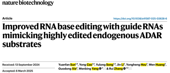 Nat Biotechnology | 裸体直播 张锐教授团队开发基于内源ADAR招募的高效体内单碱基RNA编辑技术