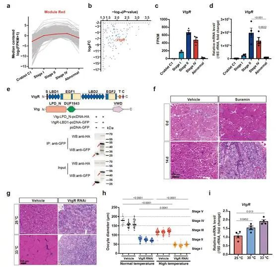 转录组分析发现,与I期、II期、IV期正常雌蟹相比,101个基因的表达水平在黄油蟹卵巢内显著下调(图2),其中包括编码卵黄蛋白原受体的VtgR基因。常温(25 °C)下,敲降VtgR抑制雌蟹卵母细胞的发育。而在高温(33 °C)下,敲降组VtgR使雌蟹卵母细胞的发育完全停滞。这说明VtgR表达异常是黄油蟹形成的主要原因,拟穴青蟹的卵黄发生具有由VtgR介导的高温保护机制。