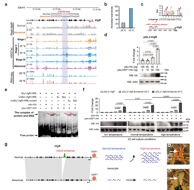 为进一步揭示拟穴青蟹卵黄发生高温保护机制的遗传基础,研究团队利用群体遗传学分析,在黄油蟹”VtgR基因的第19号内含子中鉴定到一个4.99 kb的缺失。该缺失中包含一个在拟穴青蟹卵黄发生及高温响应中均起到关键作用的增强子(图3)。其次,团队发现热激转录因子1HSF1)与VtgR的启动子区结合并介导其表达。缺失中的增强子在高温胁迫下促进由HSF1介导的VtgR的表达,维持卵黄蛋白原的正常内吞入卵。由于序列缺失导致黄油蟹失去该增强子,使其在高温胁迫下卵黄发生异常。