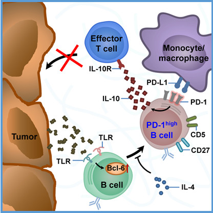 机体免疫分为细胞免疫和体液免疫两类。但以往关于肿瘤免疫主要聚焦于以T细胞和髓系细胞为主要对象的细胞免疫。然而,肿瘤临床治疗中有较好疗效的 “靶向药物”多是抗体药物。因此,阐明肿瘤中B细胞亚群、功能及其调控机制是肿瘤免疫研究亟需解决的问题。邝栋明教授课题组关于人实体瘤中B细胞亚群和功能的发现为肿瘤免疫研究及相关治疗提供新的思路。