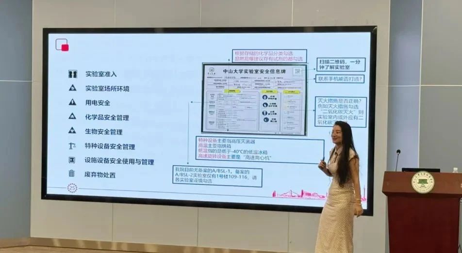 紧接着,熊丽娜老师从实验室入门须知、安全规范和要求、应急处置等多个方面进行了全面而深入的培训。她详细介绍了实验室的基本设施、设备使用规则、化学品管理、个人防护装备的选择与佩戴等关键内容,并重点讲解了火灾、化学品泄漏等紧急情况的应急处置流程。