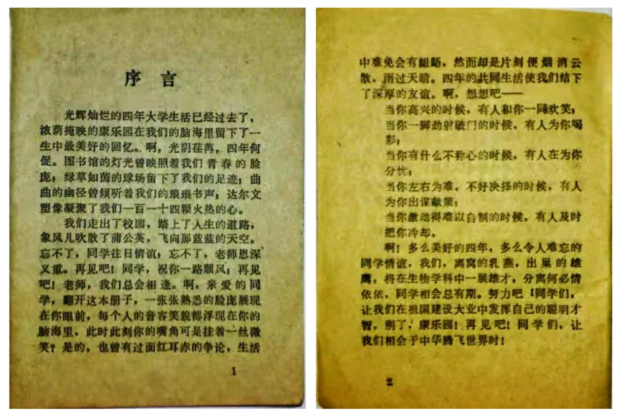 图为生物系79级毕业生的同学录序言,由生物系79级校友提供