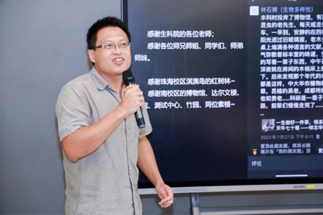 深圳市一森生态科技有限公司创始人林石狮校友介绍了公司生态场地全周期服务技术链条,打造小微生态工程的概况,也分享了在校期间与时任生科院院长徐教授之间的难忘故事。