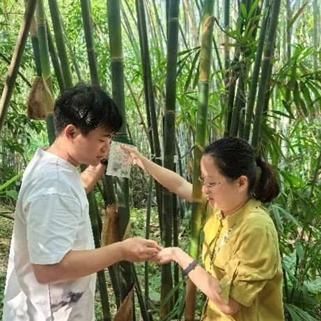 紧接着,教职工党支部的老师们引领学生支部成员步入幽静的竹园,开展竹种挂牌活动。在这个过程中,大家对中大竹园丰富多样的竹种有了更为深入的认知。这座竹园不仅是国内种类最为丰富的竹种标本园之一,更珍藏着我国数量最多的竹类活体模式标本,为早期的华南植物园竹园提供了近半数的竹种资源。除了竹子外,本竹园也零星种植有其他珍贵的植物,如国家一级保护植物猪血木(Euryodendron excelsum,山茶科),该植物由是中国近代植物分类学的开拓者和奠基人之一的陈焕镛院士亲自引入种植的。另外还有裸体直播
