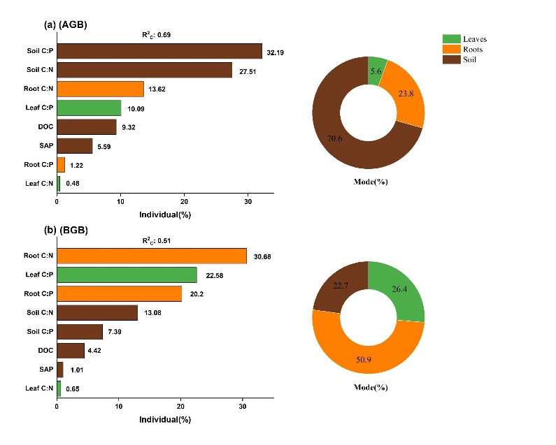 图3. 叶片、根系和土壤因子对地上和地下生物量变异的相对贡献