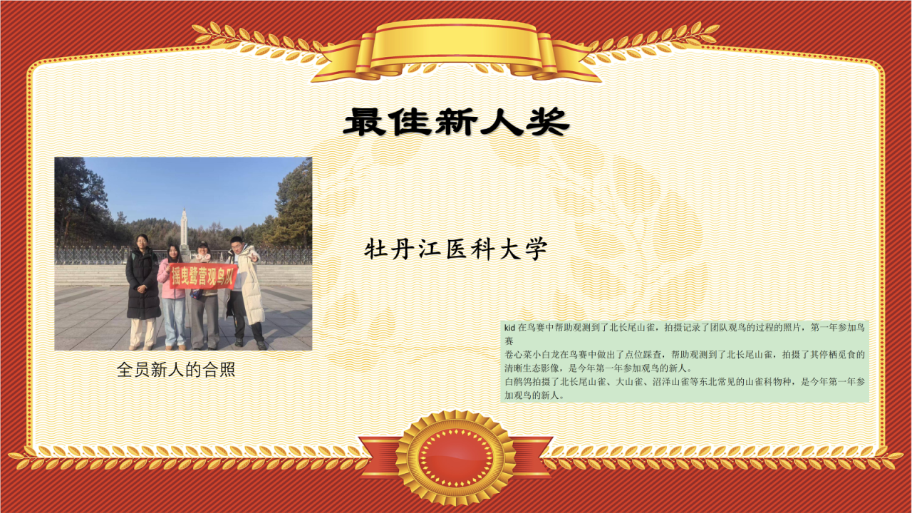 随着观鸟爱好的普及,每届鸟赛总能吸引观鸟新手们参加,慢慢把观鸟推广到更多热爱自然的朋友们中。本次鸟赛新参加的牡丹江医科大学队就是由几位观鸟新人组成,每一位成员都在鸟赛中作出了重要的贡献,让我们把“最佳新人奖”颁给他们,以资鼓励!