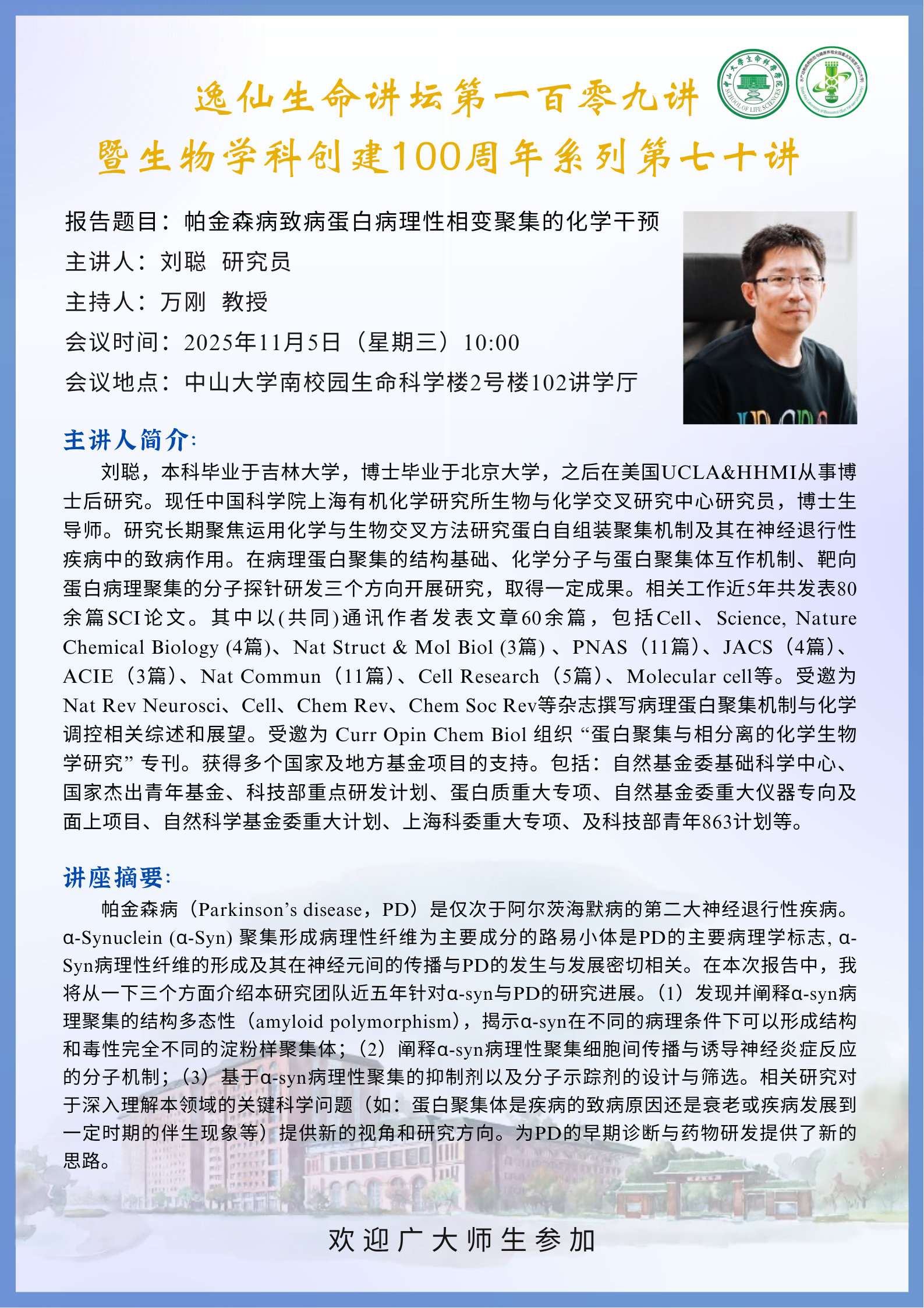 2025年11月5日裸体直播 逸仙生命讲坛第109讲:帕金森病致病蛋白病理性相变聚集的化学干预
